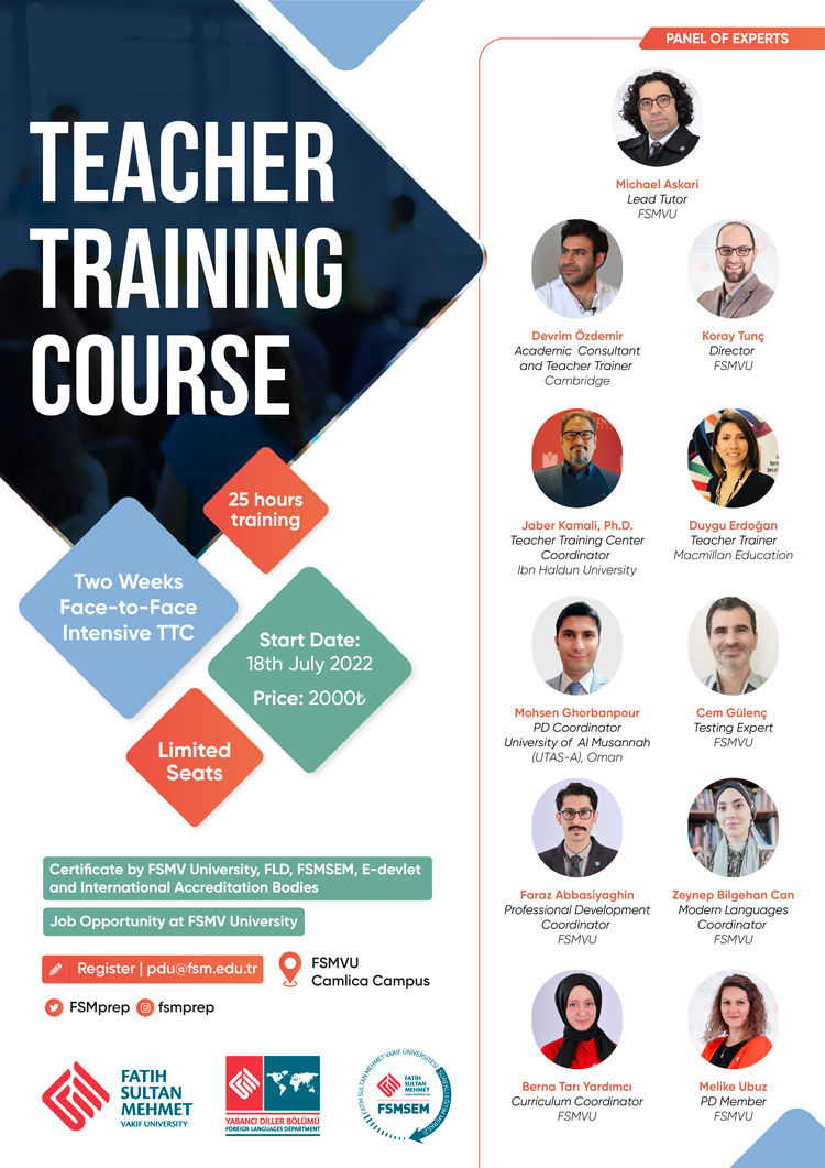 FSMVU Prep School is holding an in-house 25-hour Teacher Training Course. The intensive training will run over 2 weeks starting from 18th July to 29th, being trained by a panel of 12 ELT experts. This course will cost 2000 TL. All the applicants will receive a certificate of achievement accredited by FSMV University, FSMSEM, E-devlet and International Accreditation Bodies.
