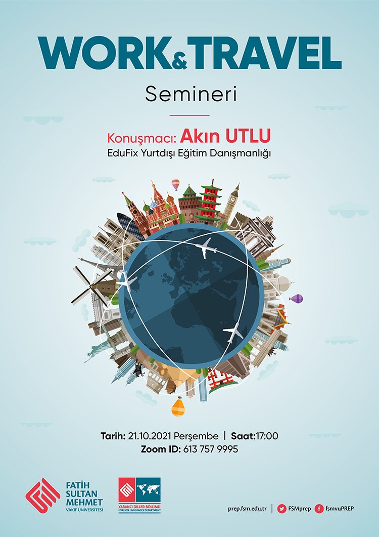 21 Ekim Perşembe günü saat 17.00'da öğrencilerimize yönelik Work&Travel semineri yapılacaktır. Yaz aylarında Amerika'da hem çalışma hem gezme hayalimi nasıl gerçekleştirebilirim sorusuna cevap bulmak için katılım bağlantısı aşağıda belirtilmiştir.