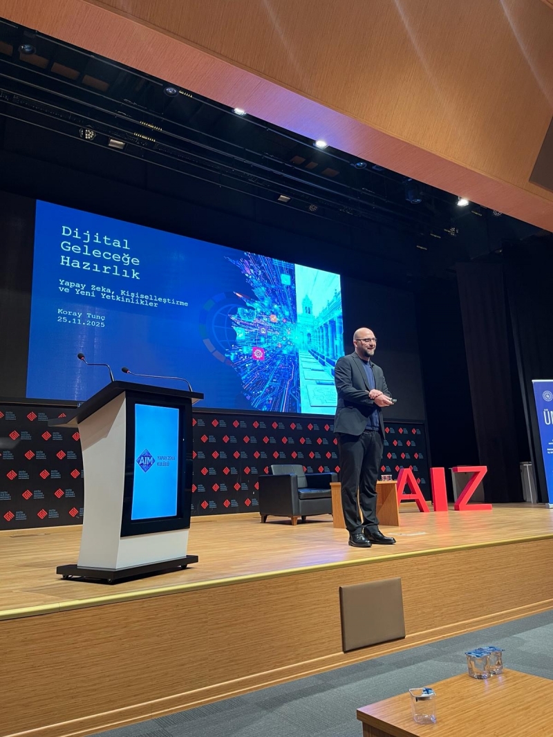 Zirve kapsamında, Yabancı Diller Bölümü Direktörümüz Koray Tunç, yapay zekâ, kişiselleştirilme ve ortaya çıkan yeni yetkinlikler üzerine odaklanan bir sunum gerçekleştirdi. Tunç, bireylerin dijital geleceğe nasıl hazırlanabileceğine dair değerli içgörüler sunarak programa önemli bir derinlik kazandırdı ve etkinliğin akademik değerini artırdı.